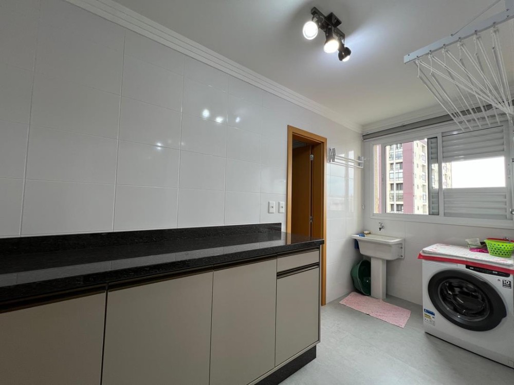 sacada com churrasqueira, lavanderia, 1 banheiro social, 2 vagas de garagem.